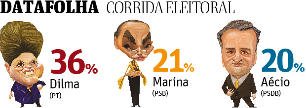 Aécio aparece com 20% das intenções de voto, o que representa empate técnico. A presidente Dilma Rousseff (PT), candidata à reeleição, tem 36% da preferência do eleitorado. As informações foram divulgadas nesta segunda-feira pela Folha de S.Paulo.