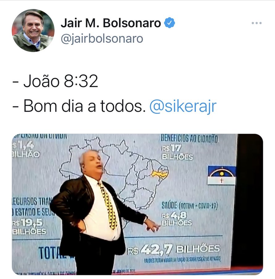 O presidente Jair Bolsonaro reproduziu em sua conta no Twitter um vídeo em que o apresentador de TV Sikêra Jr. faz críticas ao governador de Pernambuco, Paulo Câmara (PSB), a partir de cifras retratadas em seu programa como verbas da União destinadas ao Estado.