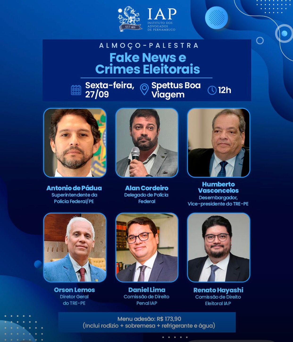 Com as eleições municipais se aproximando, o Instituto dos Advogados de Pernambuco (IAP) organiza um debate crucial sobre um dos temas mais discutidos no cenário político atual: Fake News e Crimes Eleitorais. O evento, promovido por Erika Ferraz e Eric Castro e Silva, presidente e vice-presidente do IAP, será realizado no próximo dia 27 de setembro, a partir das 12h, no restaurante Spettus, em Boa Viagem, Recife.