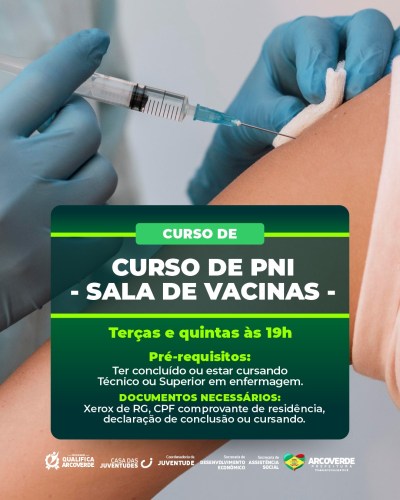 A Prefeitura de Arcoverde, através das Secretarias de Assistência Social e de Desenvolvimento Econômico, da Coordenadoria da Juventude e do Programa Qualifica Arcoverde, está abrindo nesta segunda-feira, 1° de abril, as inscrições gratuitas para o Curso de PNI – Sala de Vacinas.